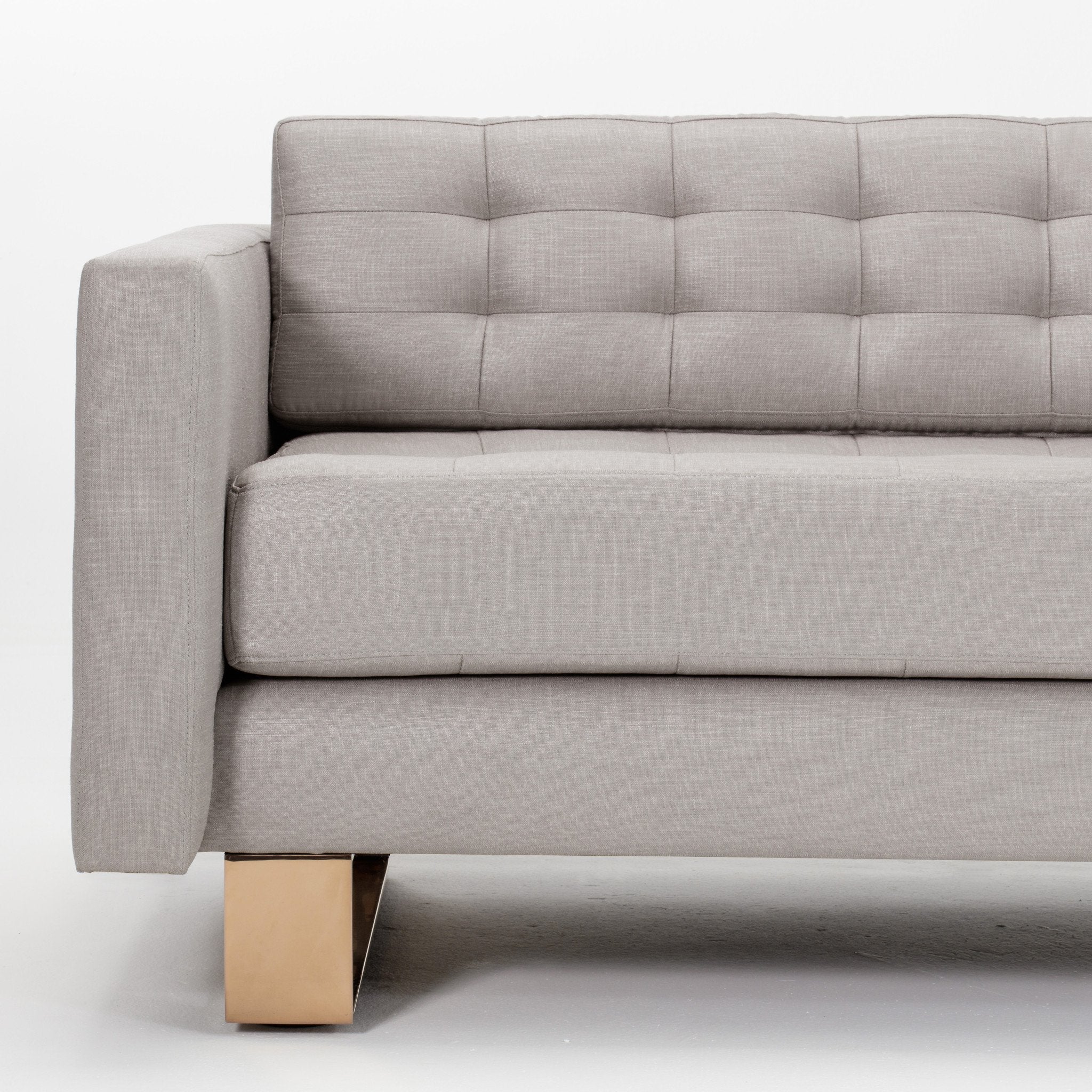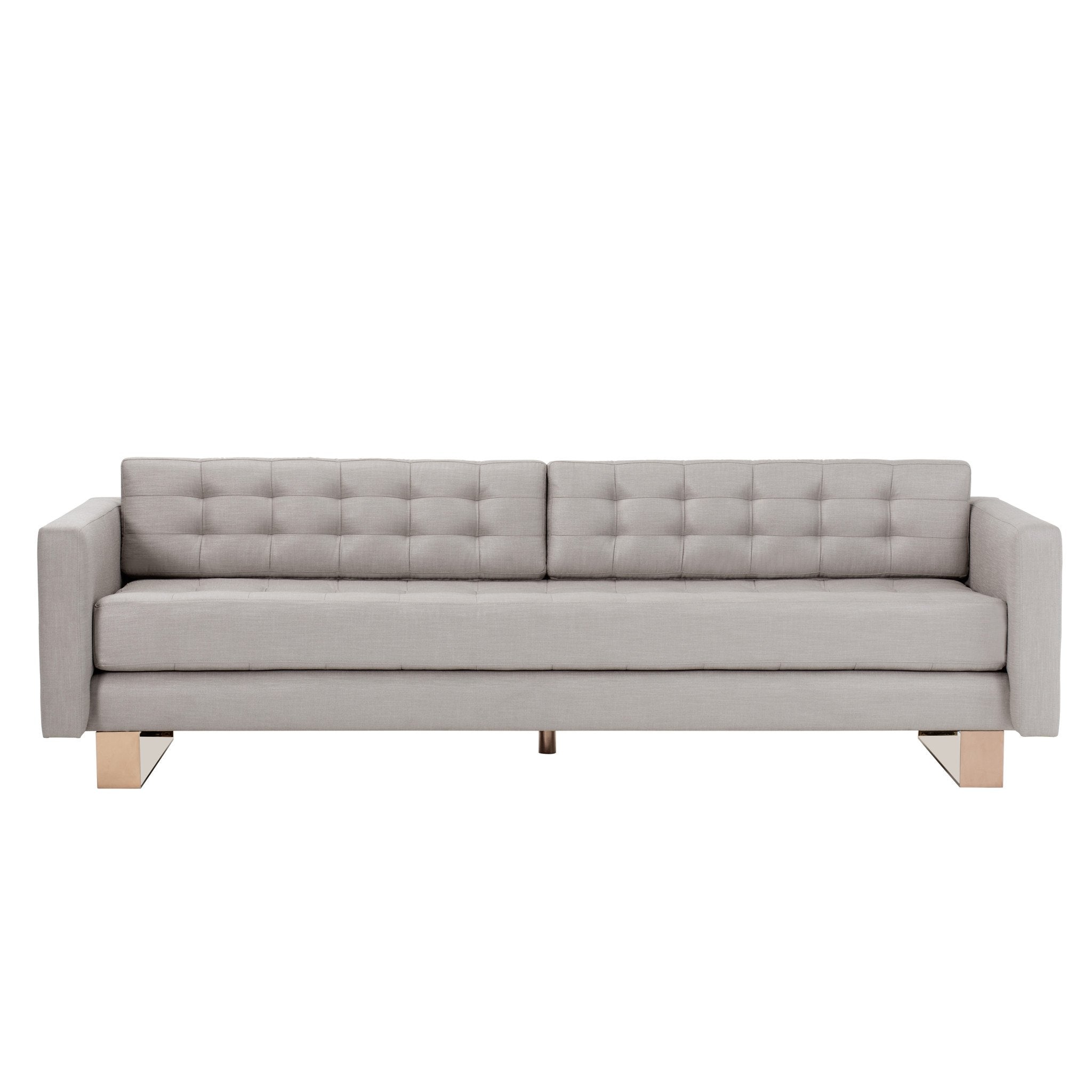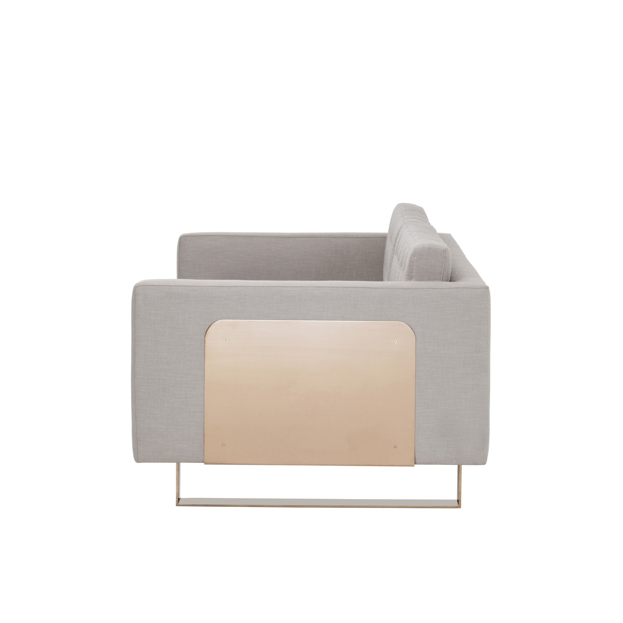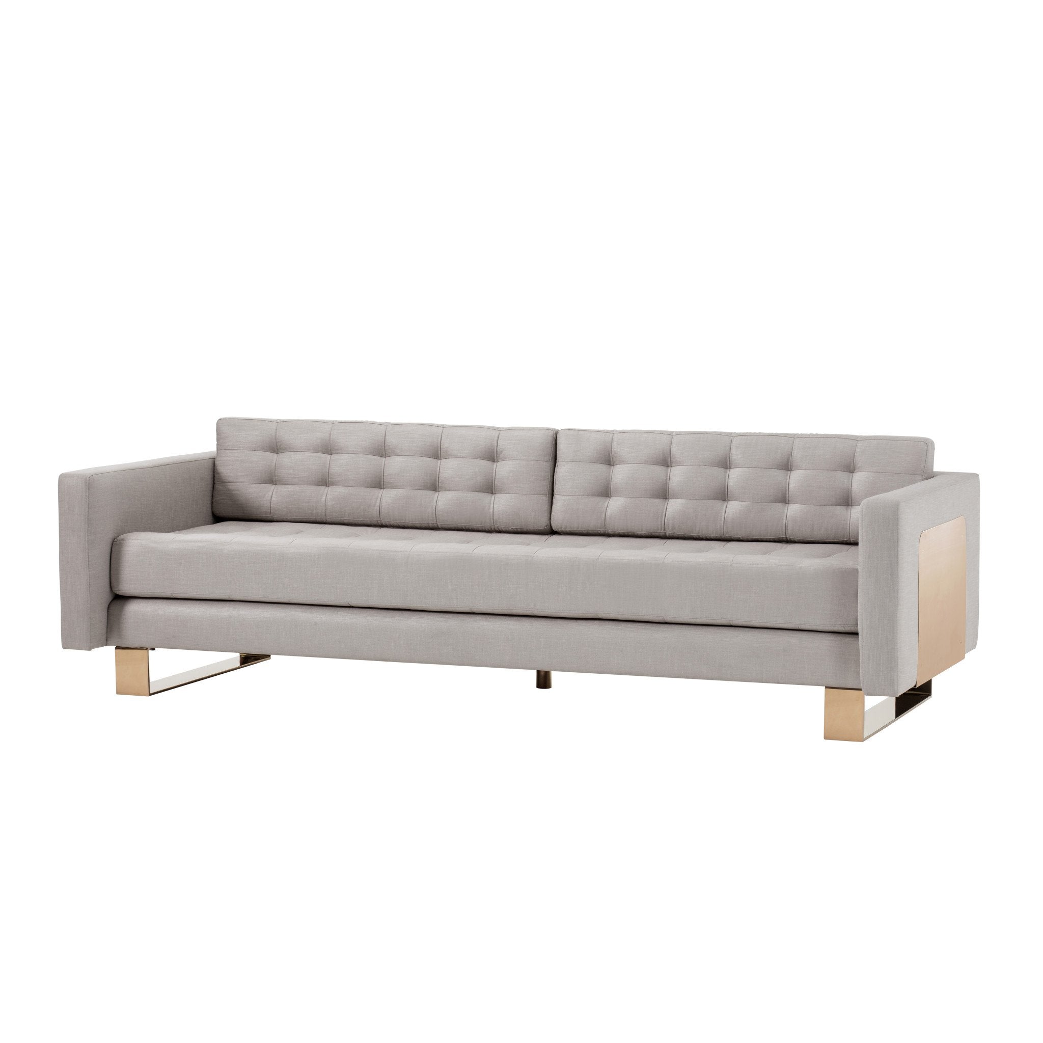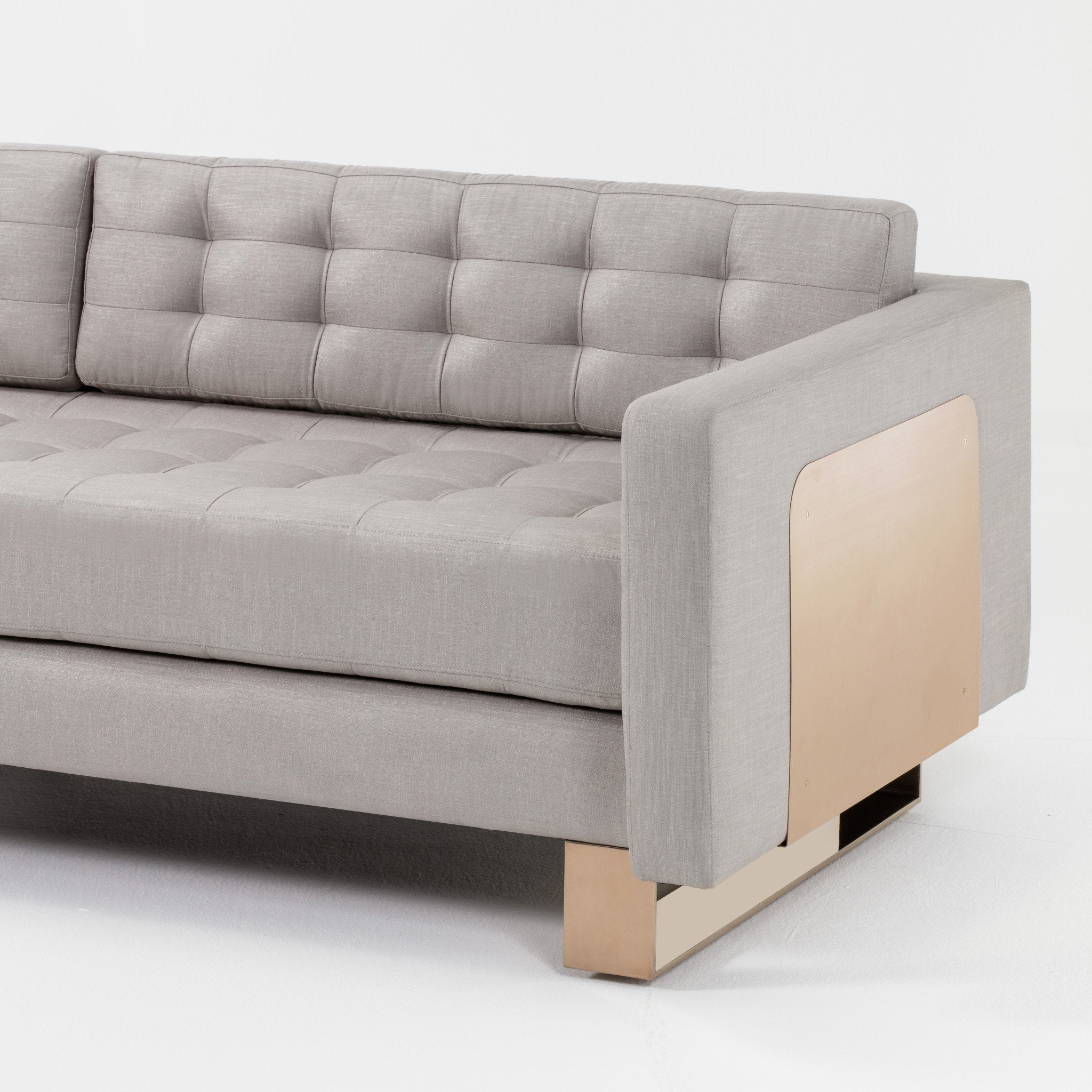 With its sculptural silhouette and low, deep profile, the Camille is a statement sofa.  Striking sledge-base legs and graphic metal wrap detail crafted from polished stainless steel in a rose gold finish are offset by a hand-tufted bench seat in Kelly’s signature neutral upholstery.  Legs/frame also available in polished stainless steel finish.