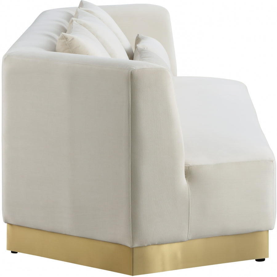 Revamp your living room, den or great room with this Celestine velvet sofa. This handsome piece features a bold contemporary look that’s well at home in most modern décor themes. Plump pillows add a little something extra to make you feel extra cozy. Upholstered in soft grey velvet, this piece fits in nicely with nearly any other colors in the room, and the brushed gold stainless steel base ensures its up-to-the-minute look.