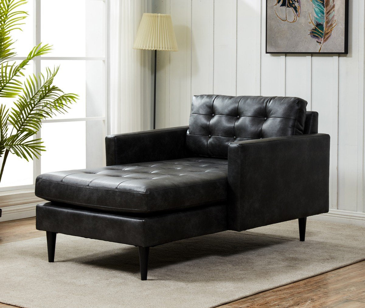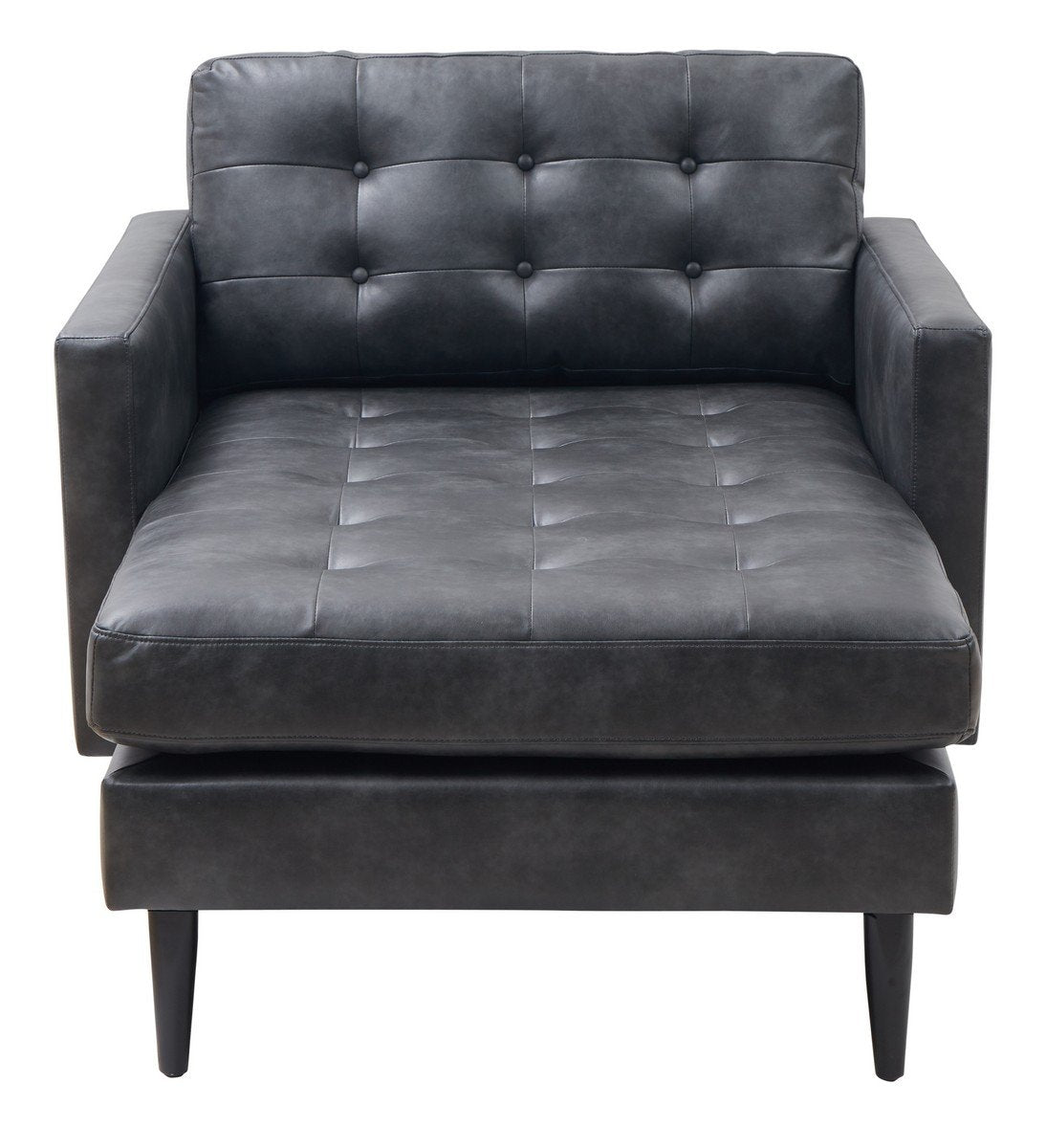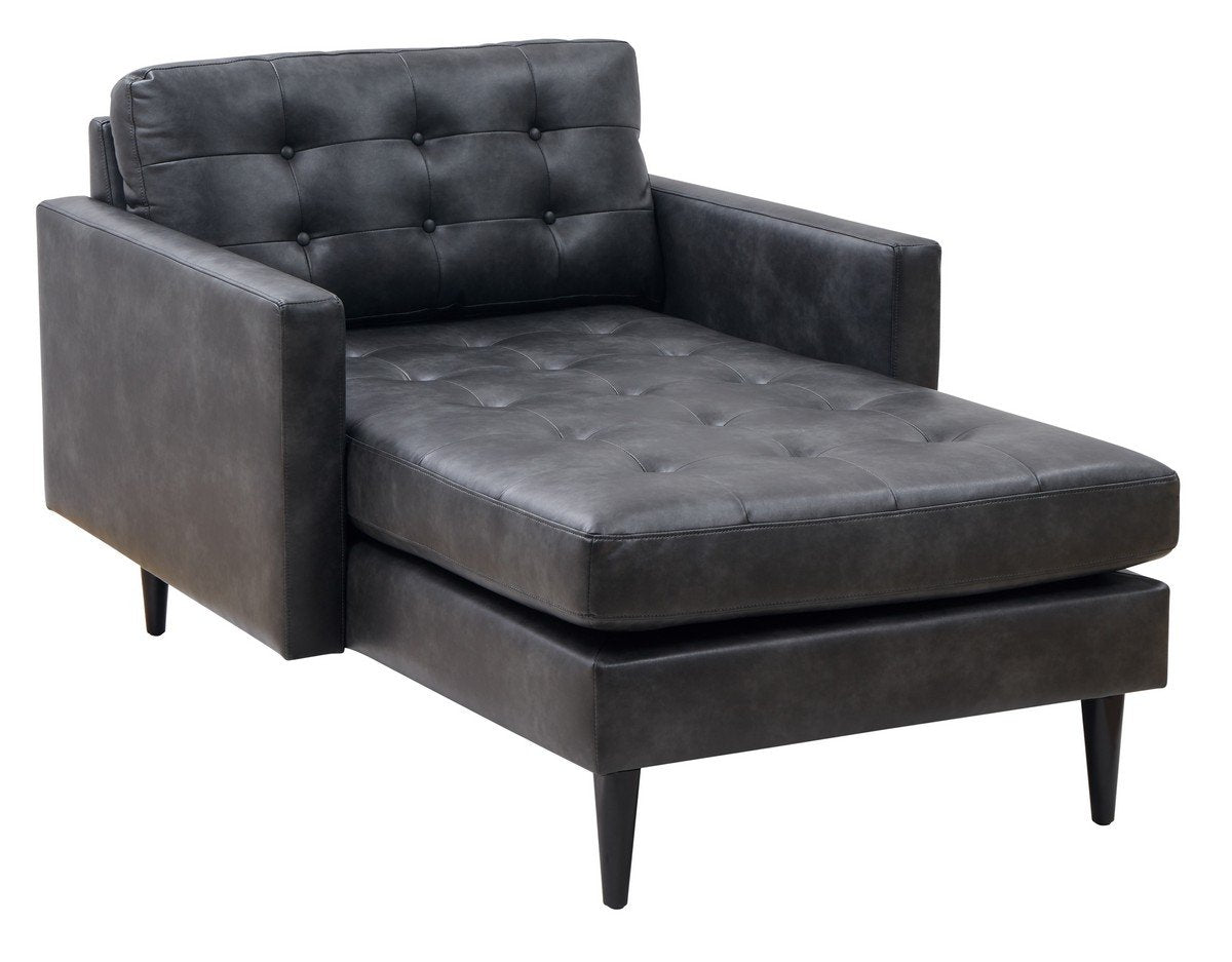 This Raymond Chaise is an undeniable invitation to relaxation in any room. Raymond allows you to lounge in luxury after a long day on your feet surrounded by generously tufted grey vegan leather, its elongated silhouette perfect for unapologetically stretching out.