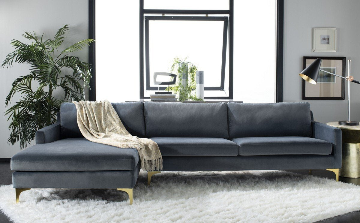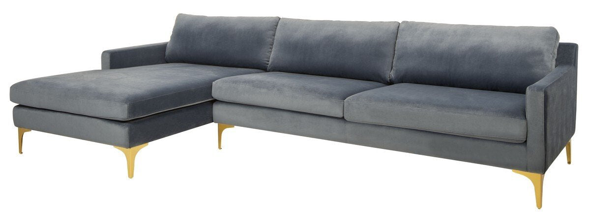 A perfect pairing of minimal lines while still conveying luxurious style, this contemporary chaise sectional sofa updates any living room. Designed with velvet upholstery in a soothing dusty blue, it complements any décor. Its modern gold legs add an elegant sculptural touch.
