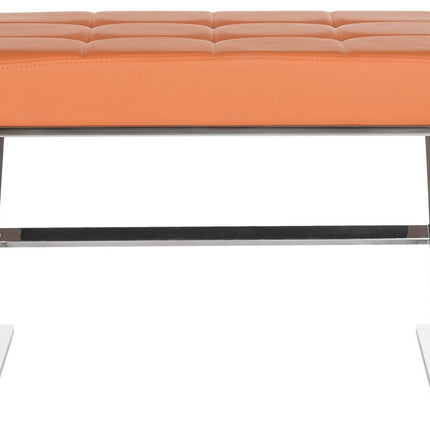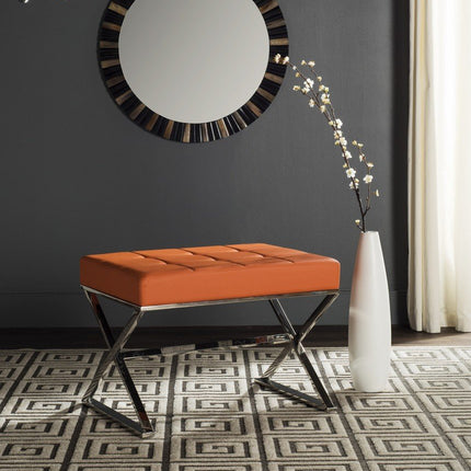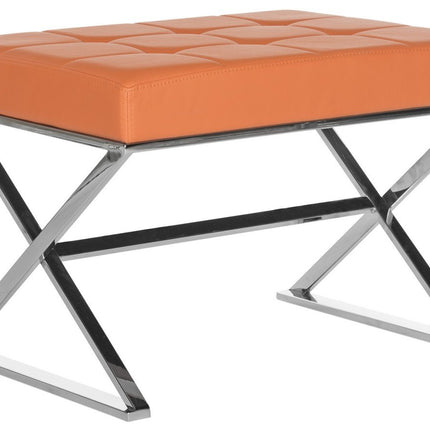 Inspired by the design classics from Bauhaus workshops, this Channa Ottoman is modern luxury at its finest. Channa’s combination of orange PU leather and a crossed geometric base of polished stainless steel make it effortlessly chic, ideal for extra seating or an impromptu cocktail tray.
