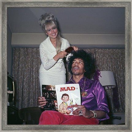 Jimi Hendrix having his hair done by a blonde lady while reading 'Mad' magazine, circa 1968
