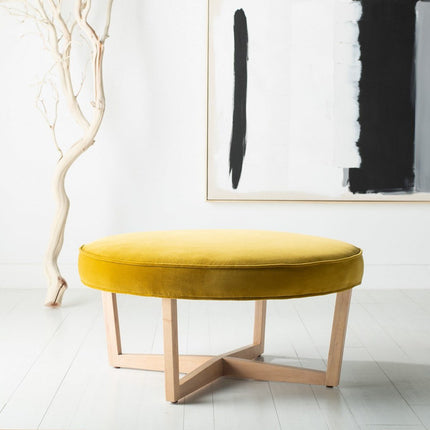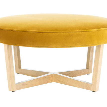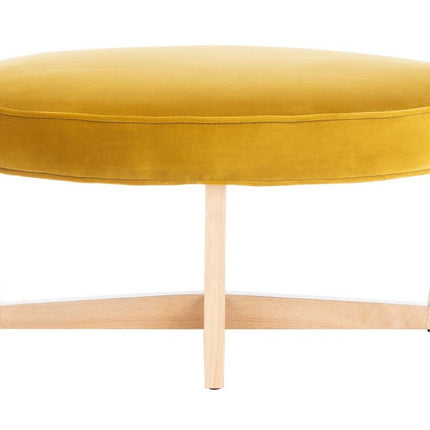 A contemporary vision of glamour, this posh velvet ottoman is an exquisite blend of style and substance. Crafted with luxurious gold velvet upholstery, it rests on a sleek geometric wood base. It’s ideal for a tray of cocktails or an impromptu seat.