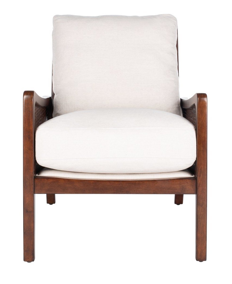 Invest in classic-contemporary design with this impeccable wood frame accent chair. A tasteful meeting of modern and retro styles, this comfortable seat is upholstered with a rich blend of smooth viscose, soft cotton, and fine linen in neutral oatmeal.
