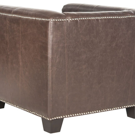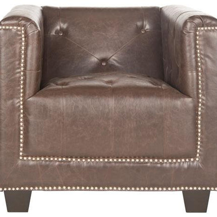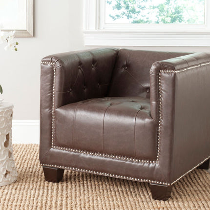 Recalling the tailored elegance of Art Deco furniture, the Tinely Club Chair features a square frame with luxurious button tufting. Antique brown PU leather, nailhead trim, and espresso-finished birch wood legs evoke the strong geometric motifs of the 1920’s. Tinely signals a return to glamour in interior design.